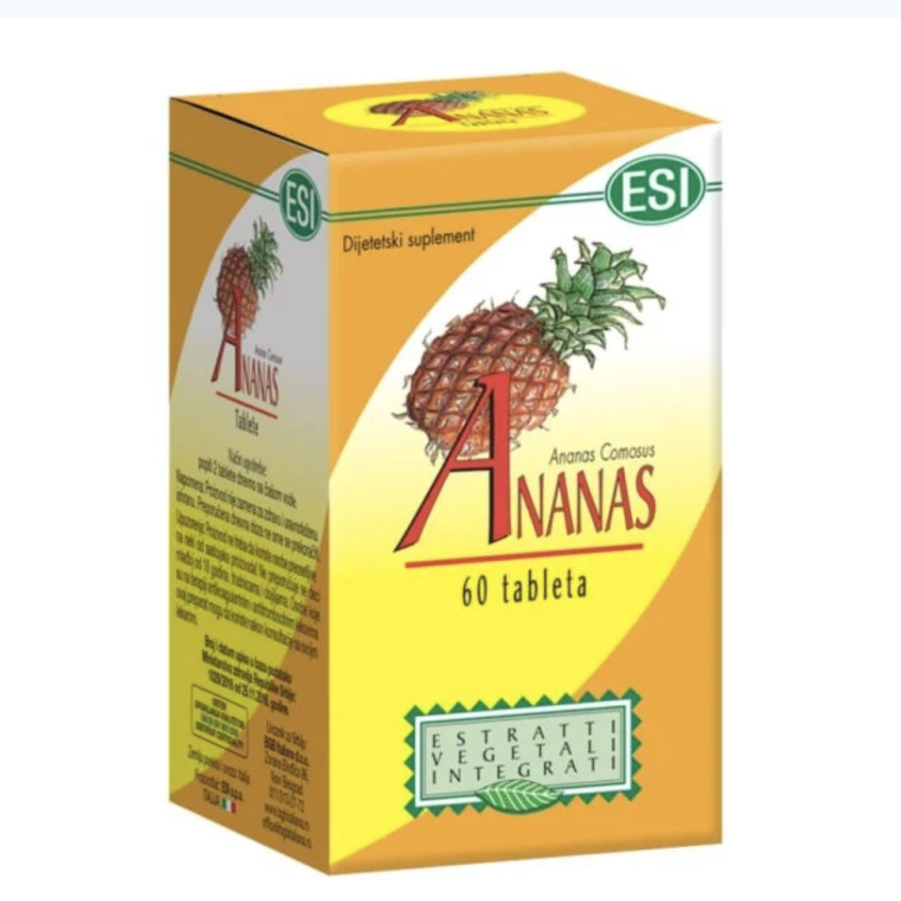 ESI ANANAS je dodatak ishrani na bazi ananasa koji povoljno utiče na varenje, izbacivanje tečnosti iz organizma i na razgradnju celulita i masnih naslaga. Ubrzava limfnu drenažu i eliminaciju viška tečnosti.