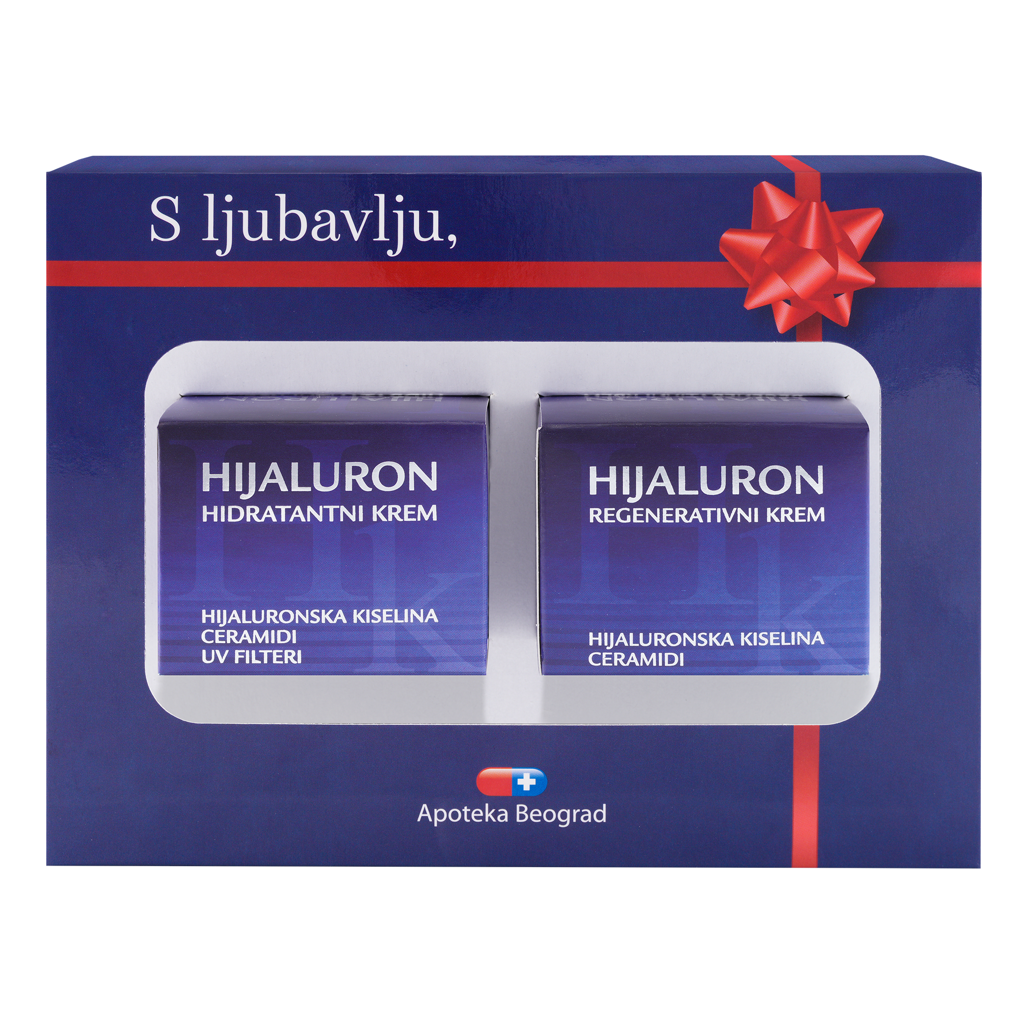 Komplet set sadrži Hijaluron hidrantni krem i Hijaluron regenerativni krem. Formule prijatne teksture koje u svom sastavu kombinuju moćne sastojke kao što su hijaluronska kiselina, ceramidi, fitosfingozin, ulje noćurka, avokada, jojobe i ši buter. Obezbeđuju 24-časovni intenzivni efekat nege suve, normalne i dehidrirane kože. Povećavaju vlažnost, elastičnost i tonus suve i dehidrirane kože. Redovnom upotrebom koža ostaje zdrava i meka, a vidljivi znaci starenja i postojeće bore manje primetnim. Molekuli hijaluronske kiseline akumuliraju vodu čime obezbeđuju bogato vlaženje kože. Ceramidi, fitosfingozin i biljna ulja pomažu održavanje prirodnog hidro-lipidnog sloja kože i povećavaju njenu elastičnost.
